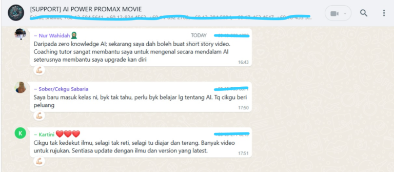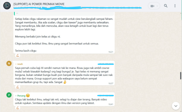 NOTA: AI Power Promax Movie ialah sebuah kelas online dalam bentuk video training dan sesi zoom setiap hari Selasa pukul 10.30 malam lengkap dengan whatsapp group support.